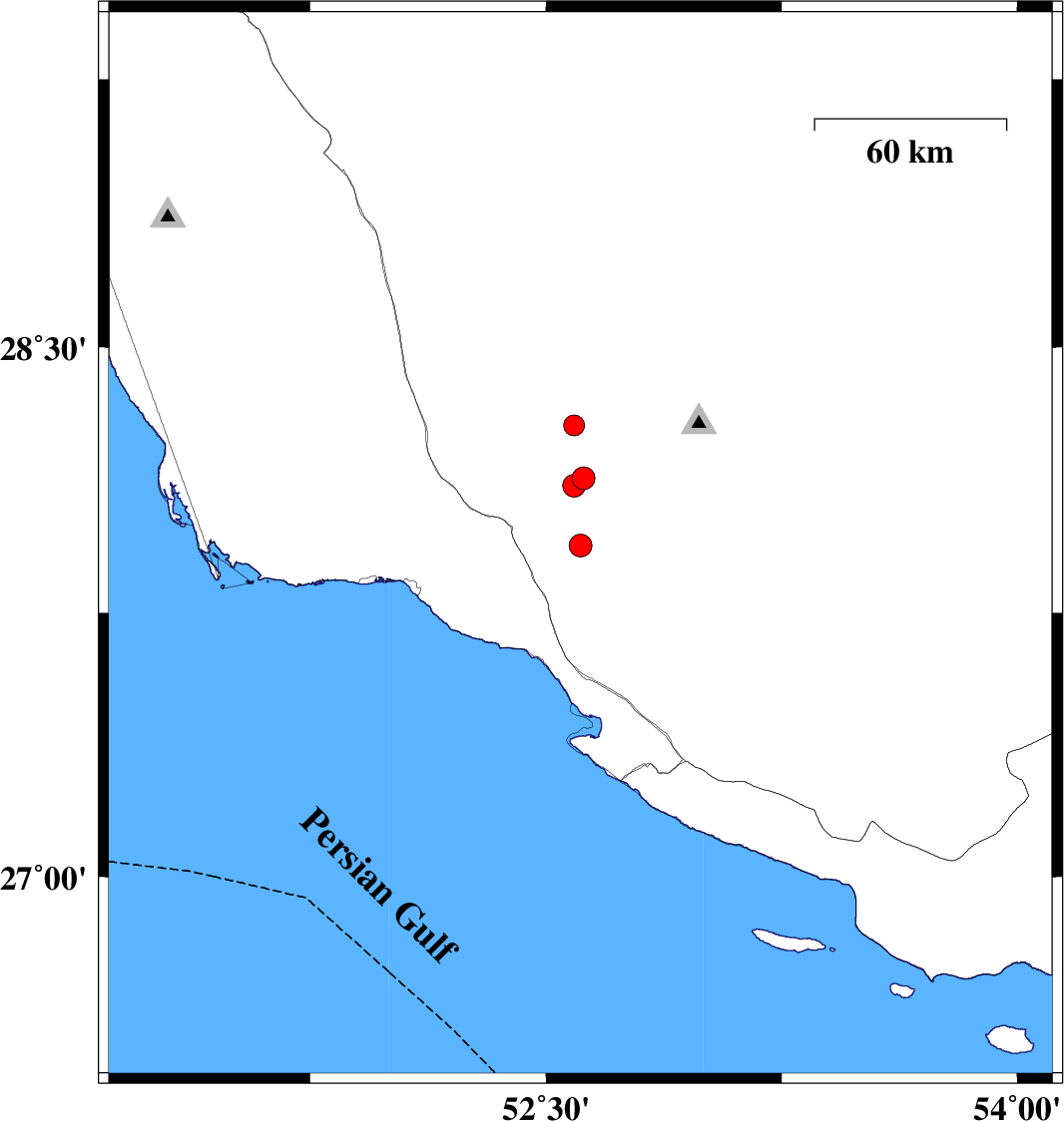 | 2010/11/30 | 16:01:42.0 | 19:31:42.0 | 28.11 | 52.59 | 14 | ML:3.2 | Fars Province, 41 km North-East of Jam |