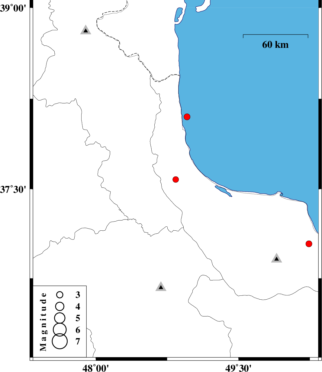 | 2010/11/09 | 16:51:27.1 | 20:21:27.1 | 38.1 | 48.96 | 14 | ML:2.9 | Caspian Sea, 33 km North of Hashtpar |