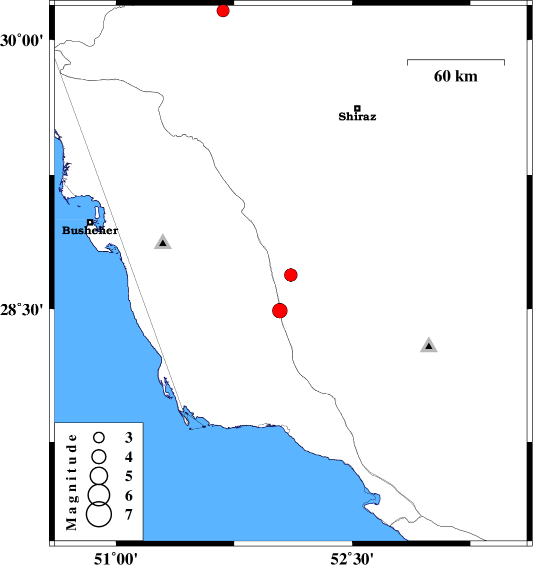 | 2010/12/07 | 11:51:58.6 | 15:21:58.6 | 30.16 | 51.68 | 43 | ML:3.5 | Fars Province, 16 km East of Nurabad |