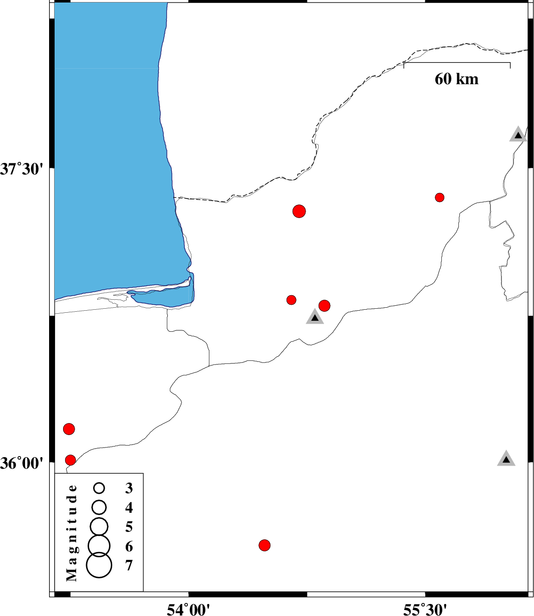 | 2010/12/15 | 22:02:33.9 | 01:32:33.9 | 37.28 | 54.7 | 18 | ML:3.6 | Golestan Province, 40 km West of Gonbad-e kavus | ||