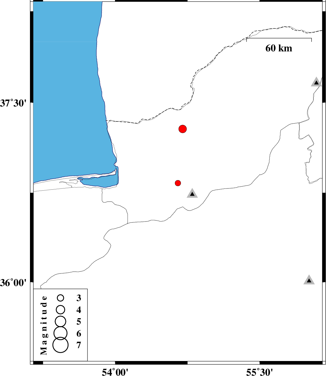 | 2010/12/15 | 22:02:33.9 | 01:32:33.9 | 37.28 | 54.7 | 18 | ML:3.6 | Golestan Province, 40 km West of Gonbad-e kavus |