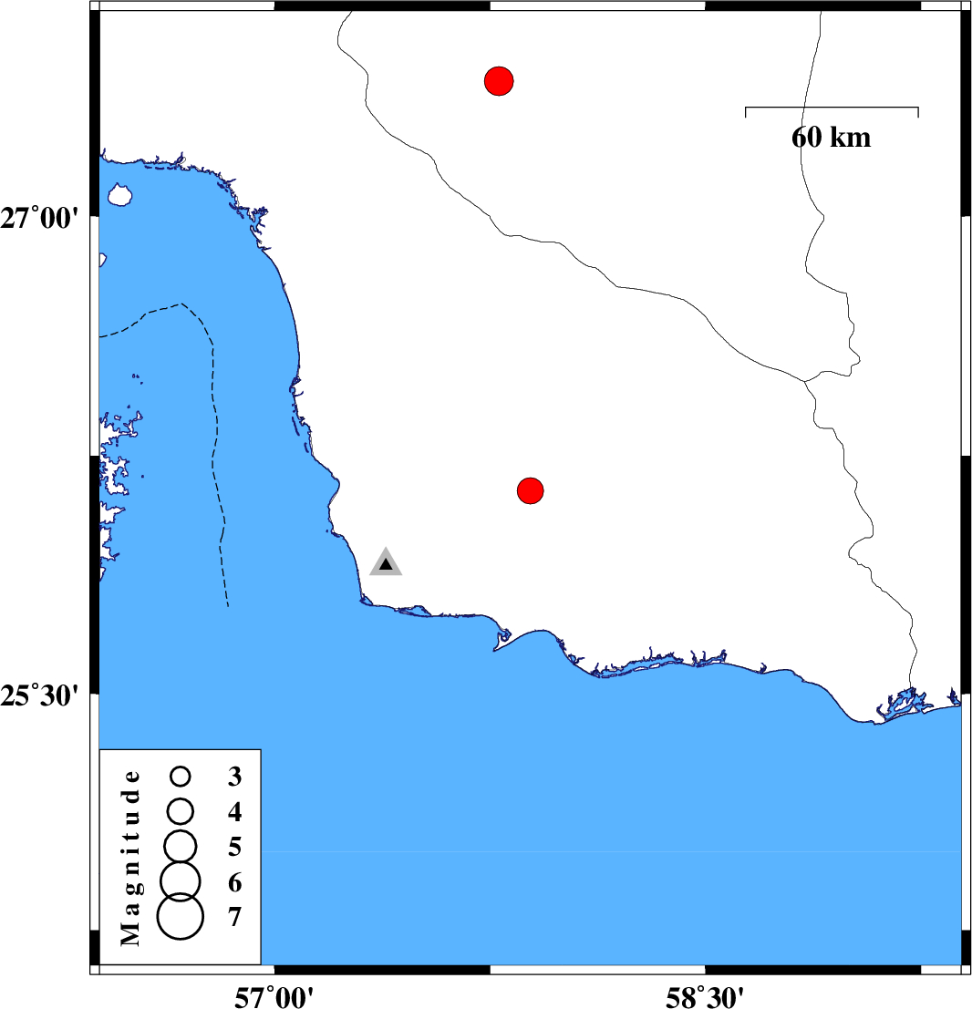 | 2010/12/17 | 07:39:20.0 | 11:09:20.0 | 27.42 | 57.78 | 15 | ML:4.5 | Kerman Province, 28 km East of Manujan |