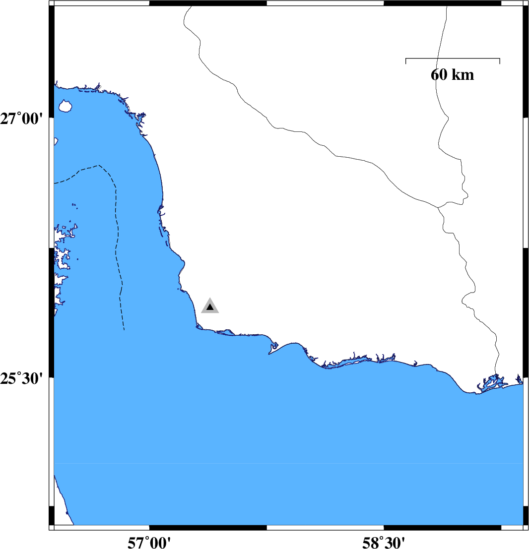 | 2010/12/22 | 19:04:51.3 | 22:34:51.3 | 26.14 | 57.89 | 46 | ML:4.1 | Hormozgan Province, 58 km North-East of Jask | ||
