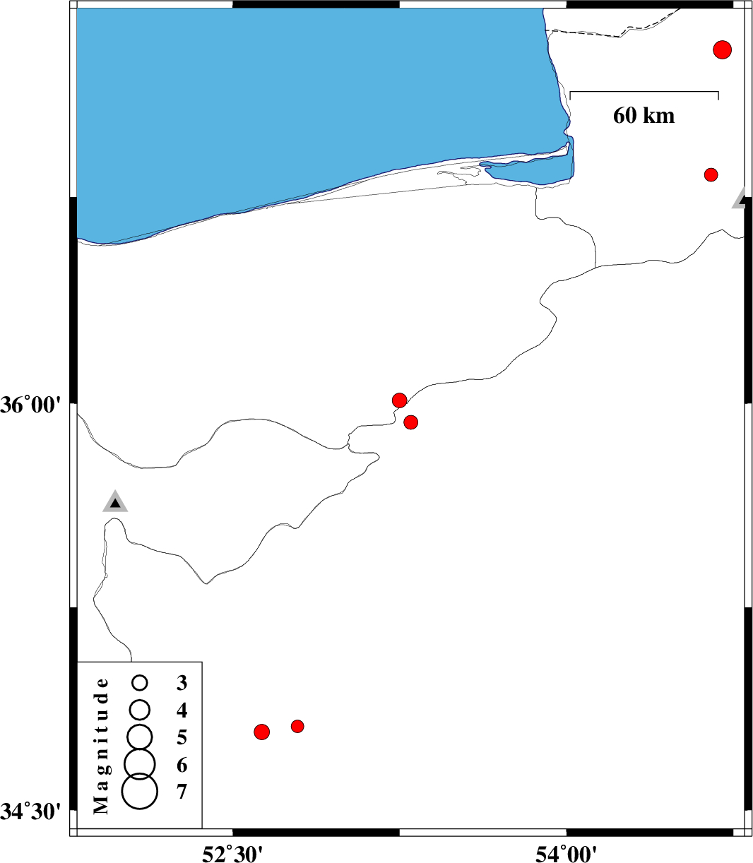 | 2011/01/03 | 00:48:21.5 | 04:18:21.5 | 35.93 | 53.3 | 14 | ML:2.8 | Semnan Province, 30 km South-East of Pol-E-Sefid | ||