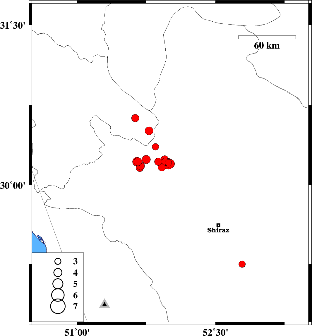 2010/12/07 | 11:51:58.6 | 15:21:58.6 | 30.16 | 51.68 | 43 | ML:3.5 | Fars Province, 16 km East of Nurabad |