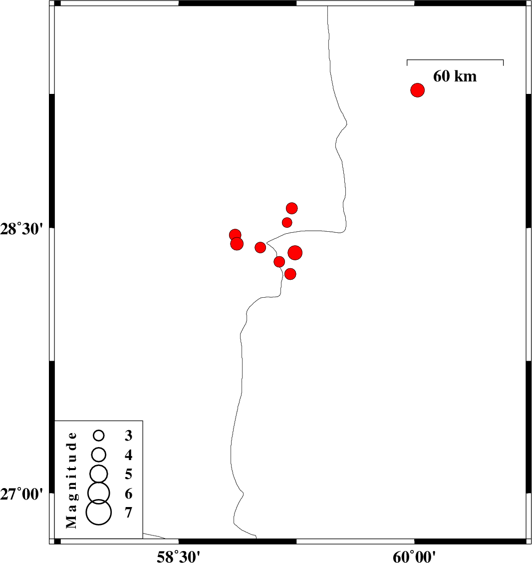 | 2010/12/30 | 02:43:03.0 | 06:13:03.0 | 28.46 | 58.86 | 18 | ML:3.4 | Kerman Province, 87 km South-East of Bam |