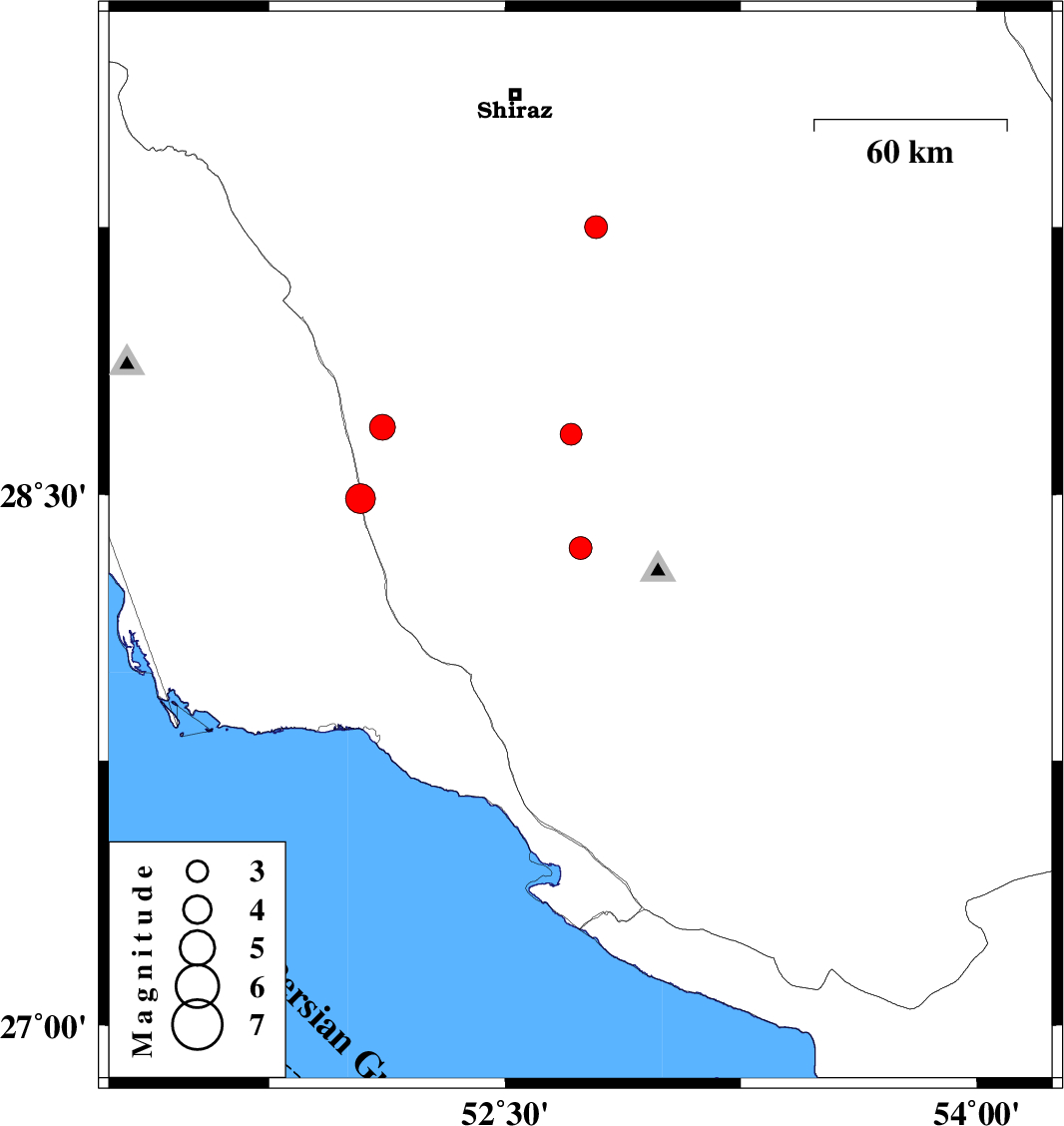 | 2011/01/08 | 20:42:43.7 | 00:12:43.7 | 28.35 | 52.74 | 15 | ML:3.3 | Fars Province, 31 km South-West of Qir va Karzin | ||