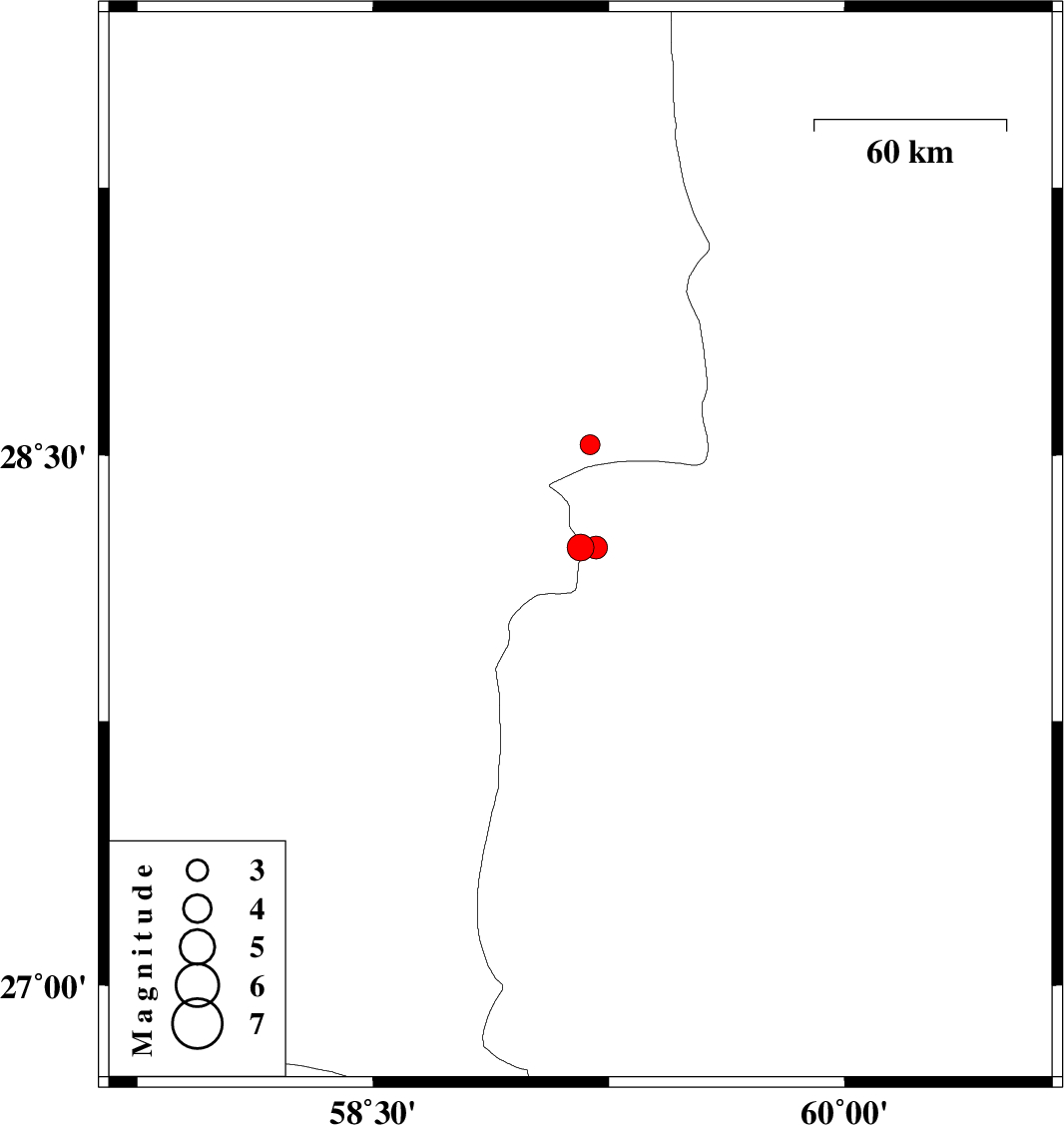 | 2011/01/10 | 15:59:32.9 | 19:29:32.9 | 28.24 | 59.16 | 15 | ML:3.8 | Kerman Province, 124 km South-East of Bam | ||