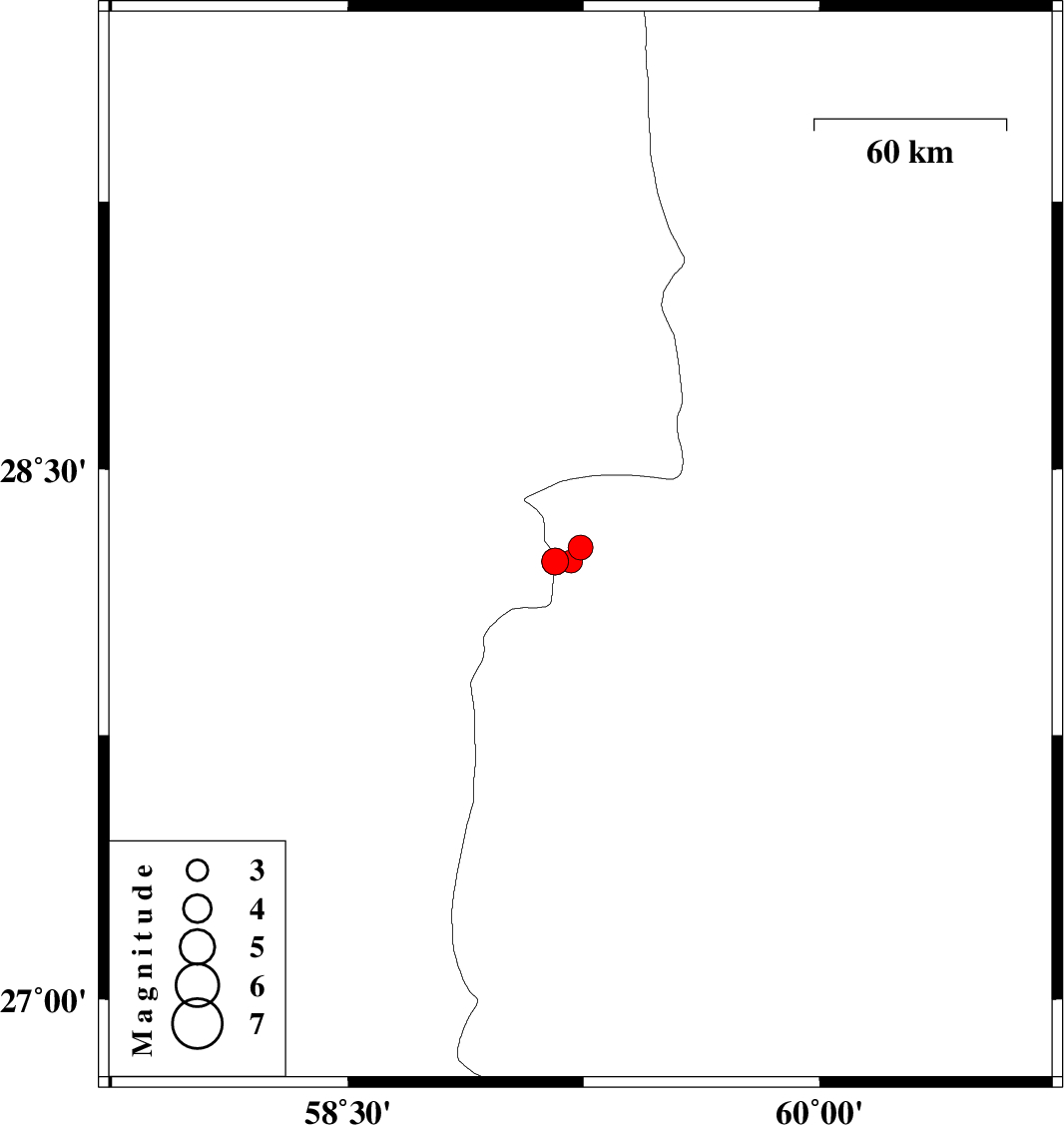 | 2011/01/10 | 15:59:32.9 | 19:29:32.9 | 28.24 | 59.16 | 15 | ML:3.8 | Kerman Province, 124 km South-East of Bam | ||
