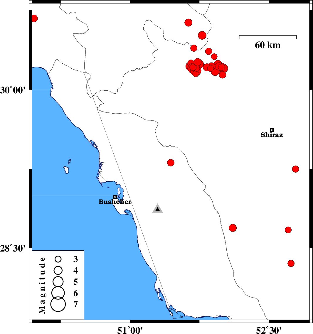 2011/01/08 | 20:42:43.7 | 00:12:43.7 | 28.35 | 52.74 | 15 | ML:3.3 | Fars Province, 31 km South-West of Qir va Karzin | ||