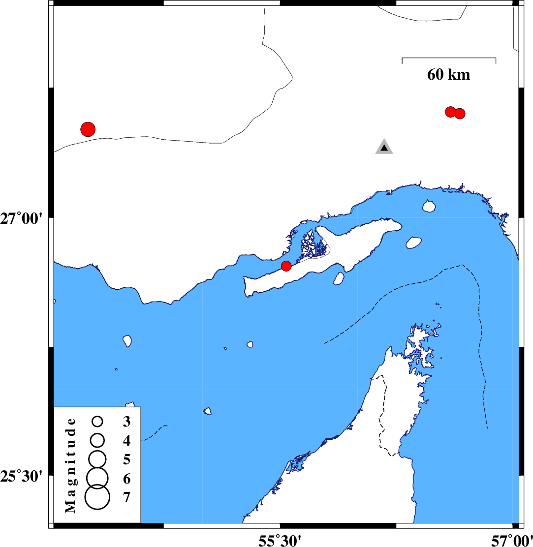 2011/01/14 | 21:54:11.0 | 01:24:11.0 | 26.72 | 55.54 | 43 | ML:2.9 | Persian Gulf, 72 km North-East of Bandar-e lengeh | ||