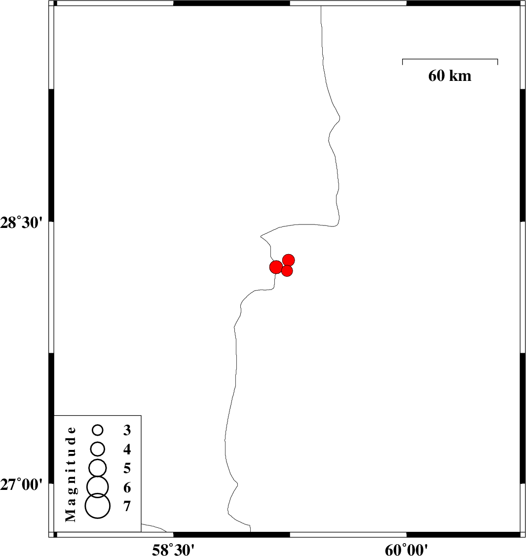 | 2011/01/10 | 15:59:32.9 | 19:29:32.9 | 28.24 | 59.16 | 15 | ML:3.8 | Kerman Province, 124 km South-East of Bam |