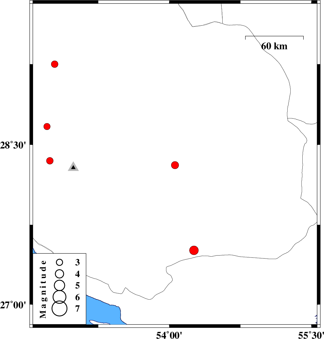 | 2011/01/08 | 20:42:43.7 | 00:12:43.7 | 28.35 | 52.74 | 15 | ML:3.3 | Fars Province, 31 km South-West of Qir va Karzin | ||