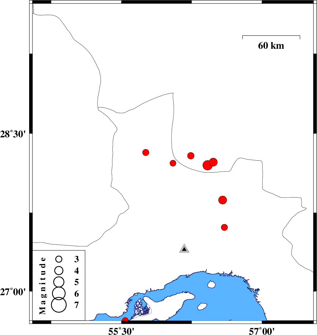 | 2011/01/11 | 08:09:03.3 | 11:39:03.3 | 27.61 | 56.6 | 14 | ML:3.1 | Hormozgan Province, 57 km North-East of Bandar-e abbas |