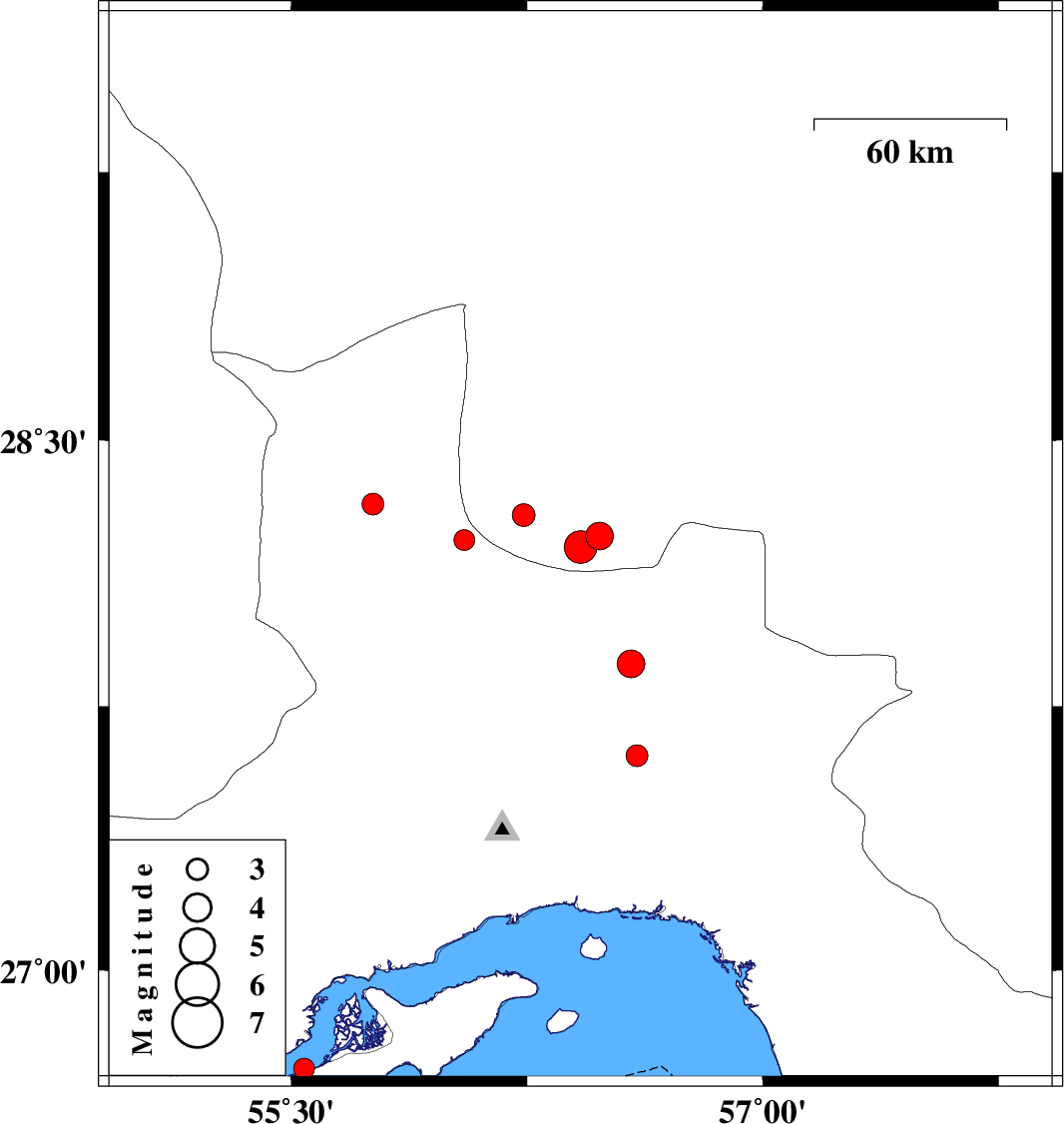 | 2011/01/11 | 08:09:03.3 | 11:39:03.3 | 27.61 | 56.6 | 14 | ML:3.1 | Hormozgan Province, 57 km North-East of Bandar-e abbas |