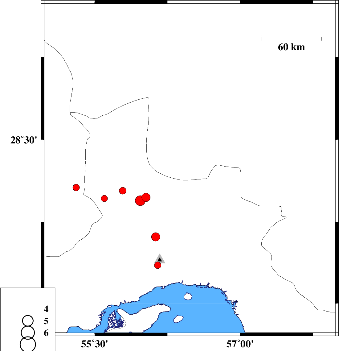 | 2011/01/18 | 06:57:27.8 | 10:27:27.8 | 27.87 | 56.58 | 27 | ML:3.9 | Hormozgan Province, 82 km North-East of Bandar-e abbas | ||