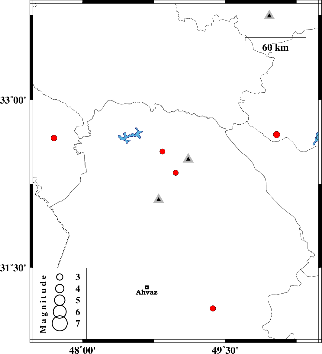 | 2011/01/19 | 03:20:50.7 | 06:50:50.7 | 32.35 | 48.98 | 27 | ML:2.6 | Khoozestan Province, 13 km West of Lali | ||