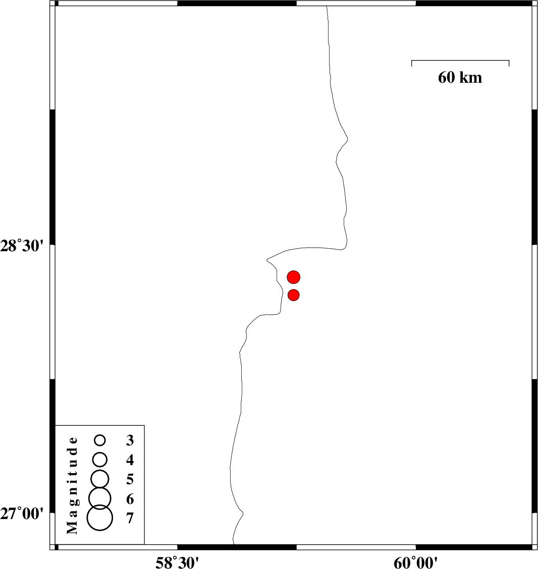 | 2011/01/20 | 06:20:16.9 | 09:50:16.9 | 28.32 | 59.23 | 18 | ML:3.6 | Sistan va Baloochestan Province, 122 km South-East of Bam | ||