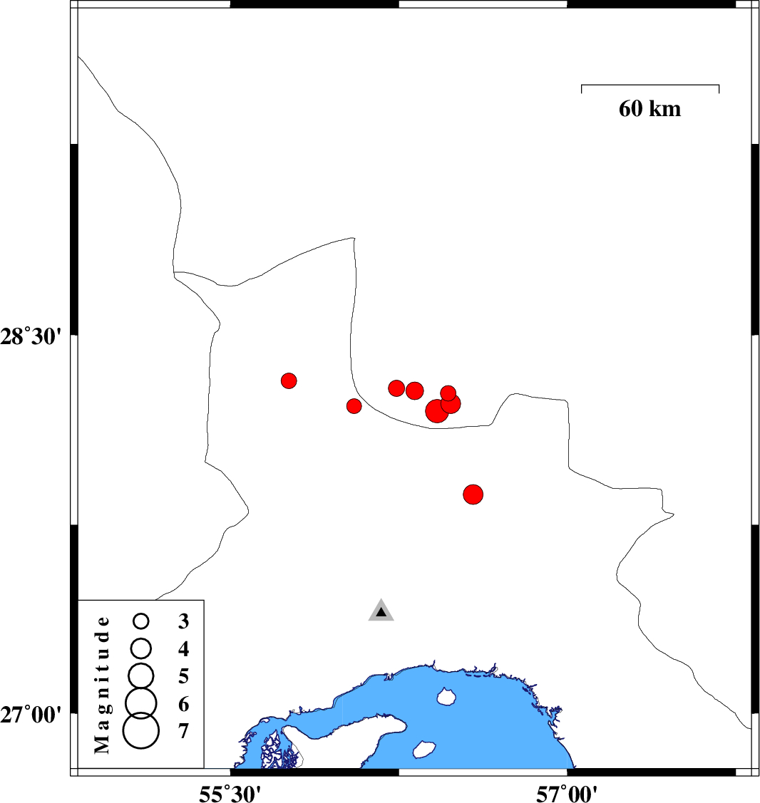 | 2011/01/18 | 06:57:27.8 | 10:27:27.8 | 27.87 | 56.58 | 27 | ML:3.9 | Hormozgan Province, 82 km North-East of Bandar-e abbas | ||