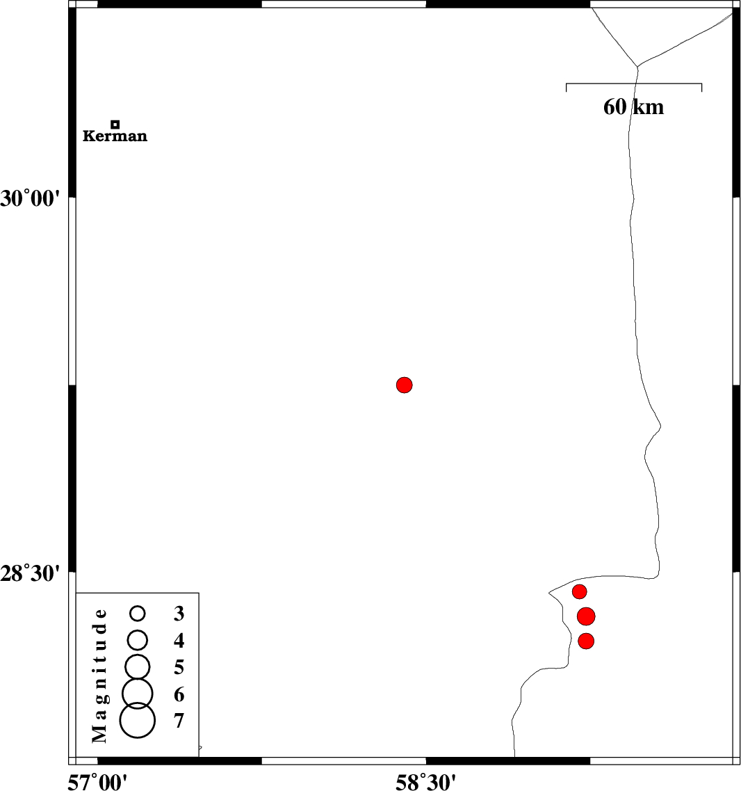| 2011/01/20 | 06:20:16.9 | 09:50:16.9 | 28.32 | 59.23 | 18 | ML:3.6 | Sistan va Baloochestan Province, 122 km South-East of Bam | ||