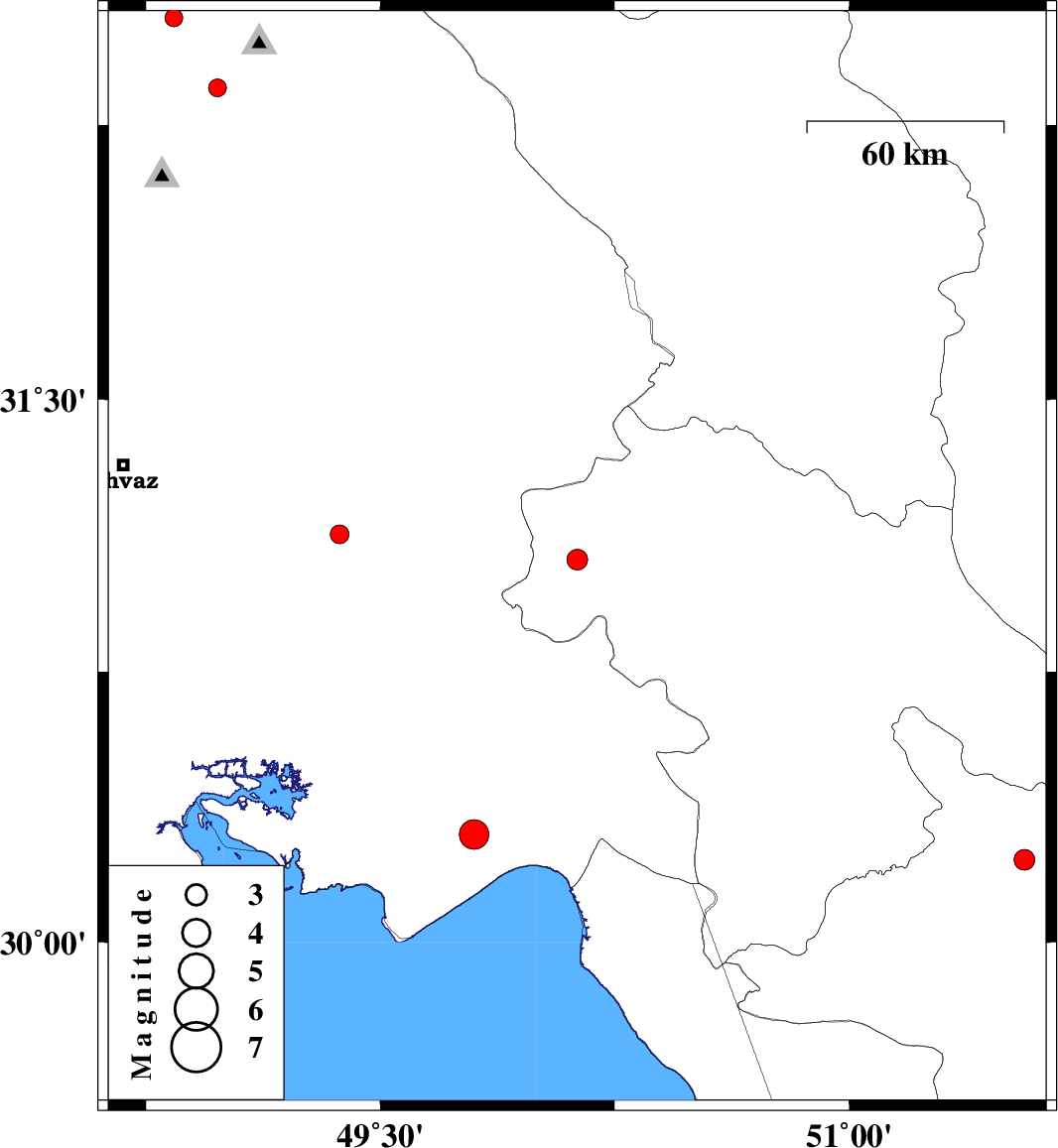 | 2011/01/19 | 03:20:50.7 | 06:50:50.7 | 32.35 | 48.98 | 27 | ML:2.6 | Khoozestan Province, 13 km West of Lali | ||