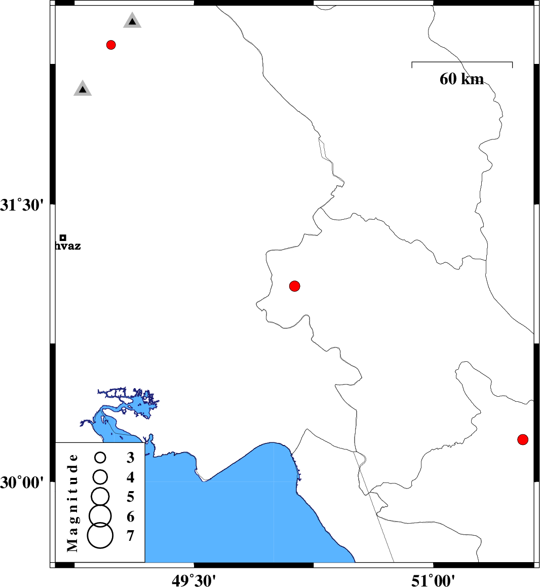 | 2011/01/19 | 03:20:50.7 | 06:50:50.7 | 32.35 | 48.98 | 27 | ML:2.6 | Khoozestan Province, 13 km West of Lali | ||