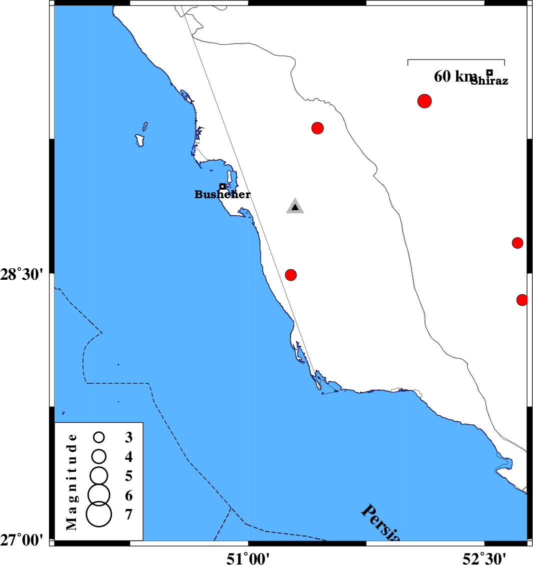 | 2011/01/13 | 17:54:44.1 | 21:24:44.1 | 29.31 | 51.44 | 6 | ML:3.4 | Bushehr Province, 23 km East of Borazjan | ||