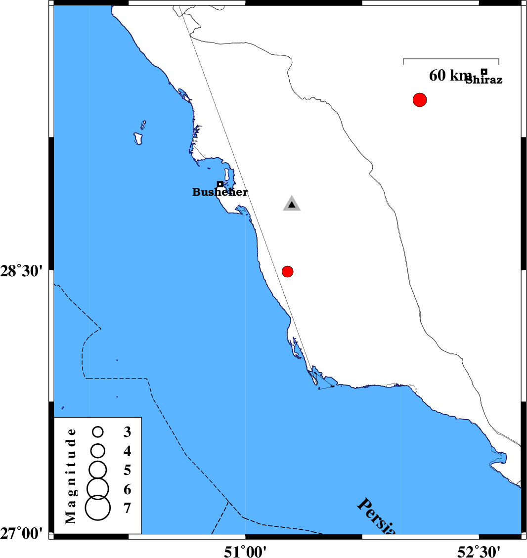 | 2011/01/24 | 17:25:01.8 | 20:55:01.8 | 28.49 | 51.27 | 18 | ML:3.2 | Bushehr Province, 21 km South-West of Khormog | ||