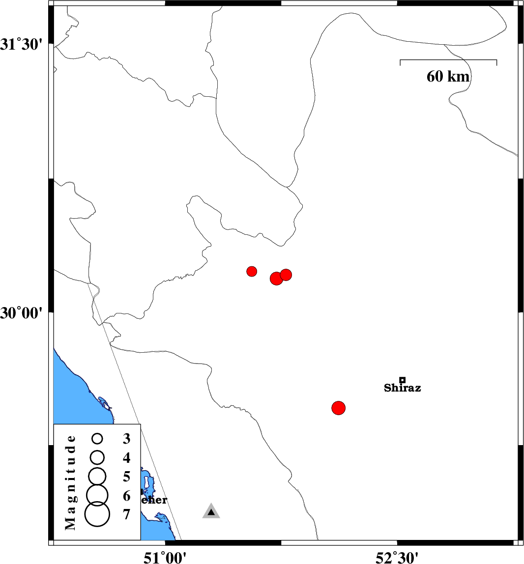 | 2011/01/25 | 07:04:07.8 | 10:34:07.8 | 30.19 | 51.72 | 38 | ML:3.8 | Fars Province, 21 km East of Nurabad | ||