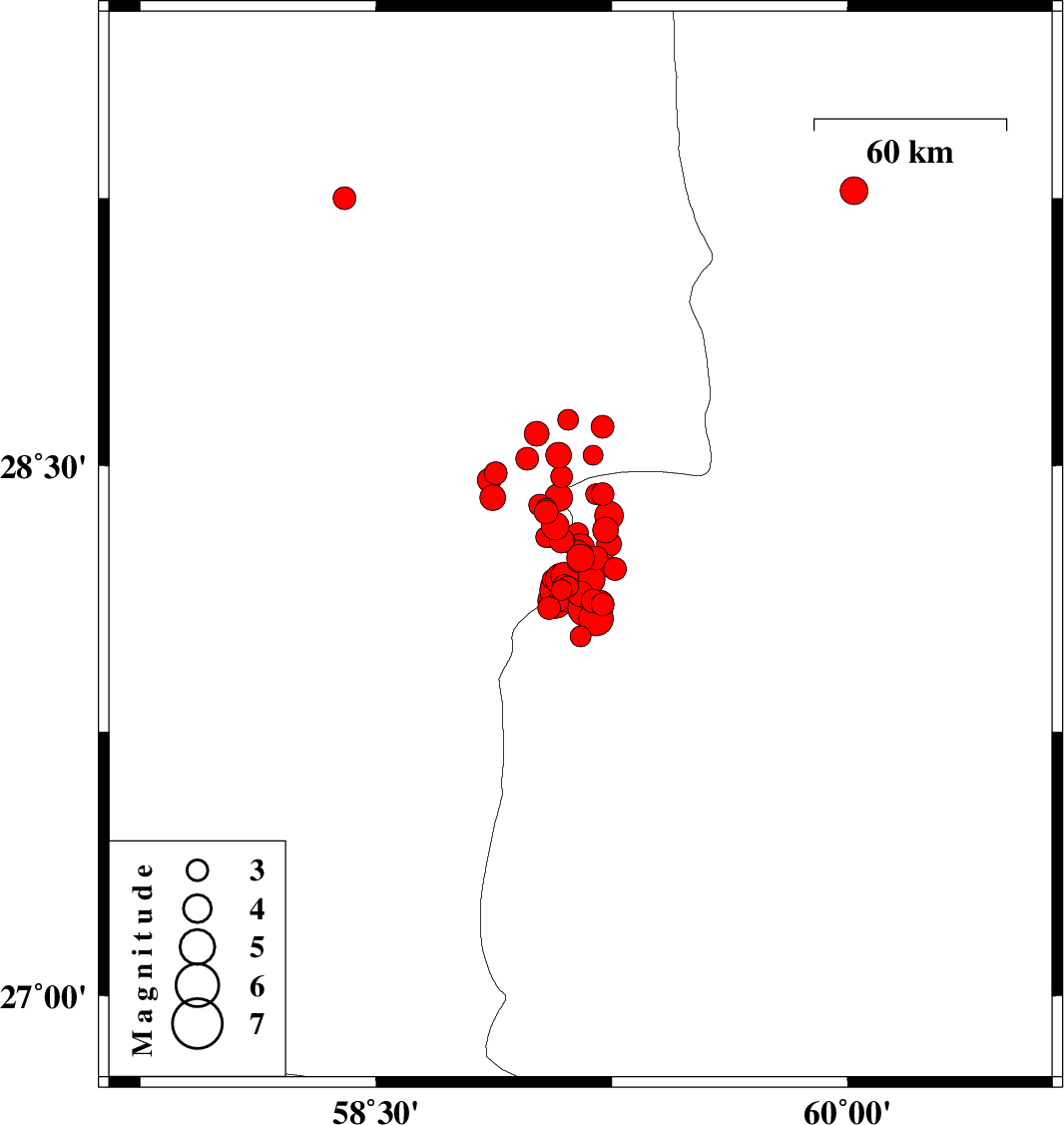 2011/01/27 08:38:28.5 12:08:28.5 28.1559.0915 Mb:6.2 Kerman Province, 139 km North-East of Kahnuj