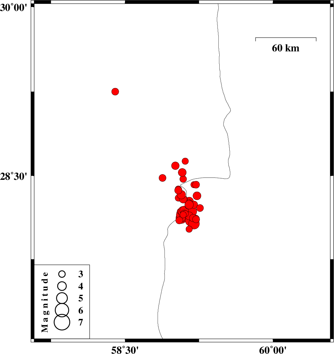 2011/01/27 08:38:28.5 12:08:28.5 28.1559.0915 Mb:6.2 Kerman Province, 139 km North-East of Kahnuj
