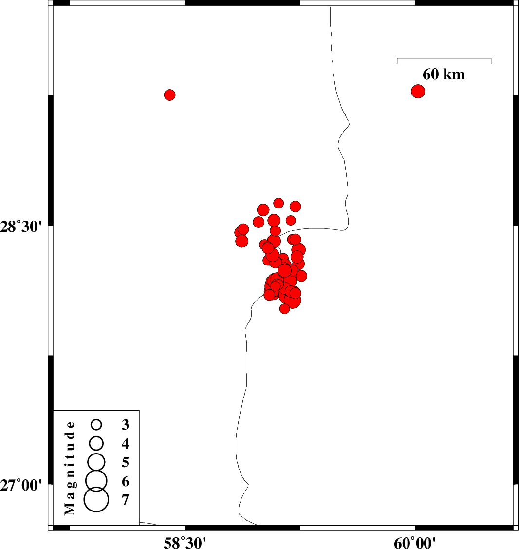 2011/01/27 08:38:28.5 12:08:28.5 28.1559.0915 Mb:6.2 Kerman Province, 139 km North-East of Kahnuj