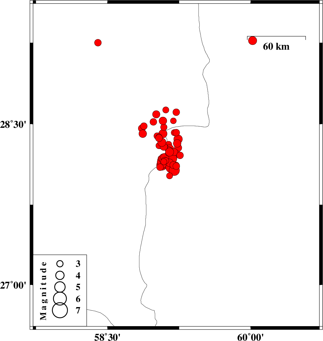 2011/01/27 08:38:28.5 12:08:28.5 28.1559.0915 Mb:6.2 Kerman Province, 139 km North-East of Kahnuj