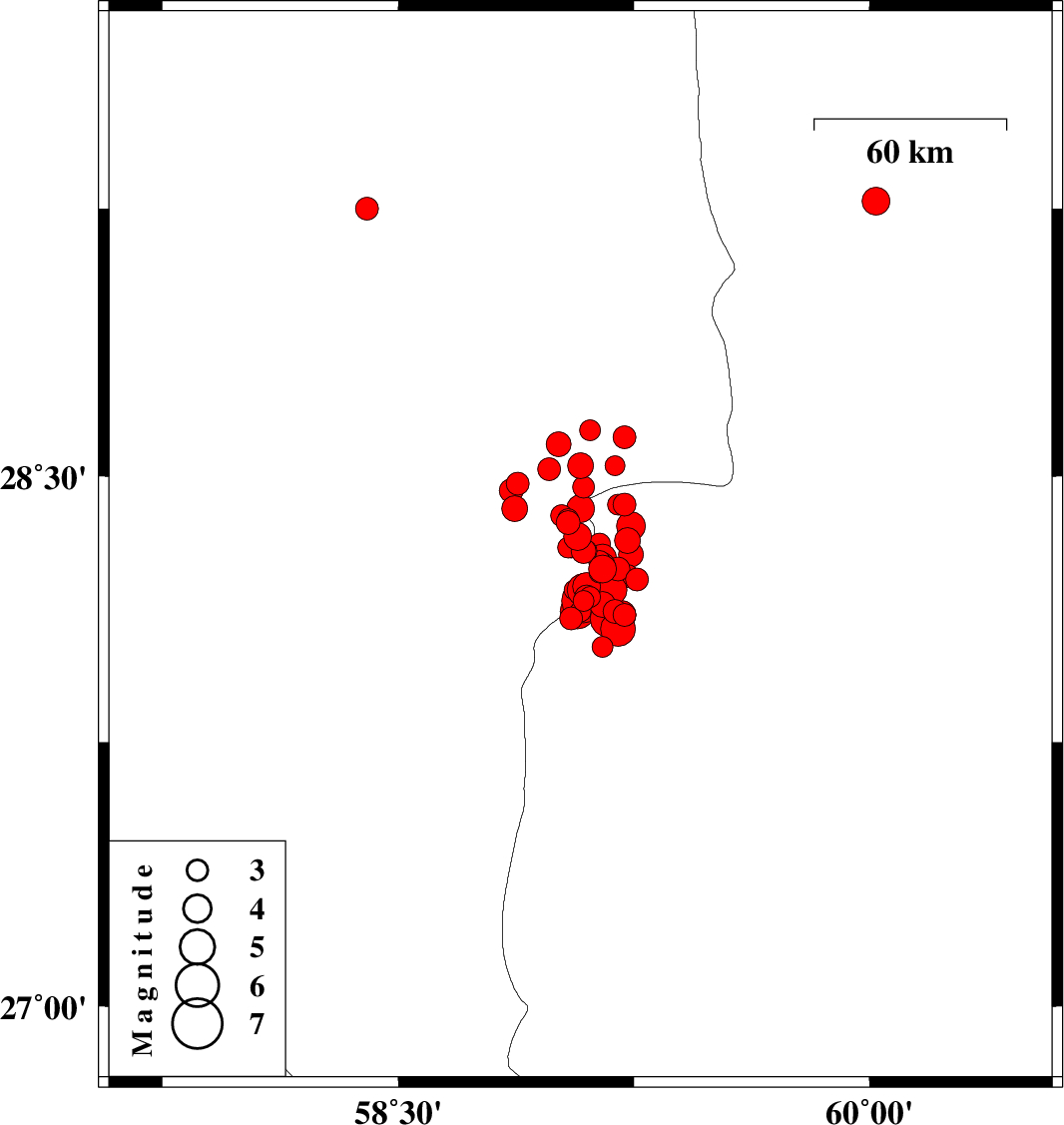 2011/01/27 08:38:28.5 12:08:28.5 28.1559.0915 Mb:6.2 Kerman Province, 139 km North-East of Kahnuj