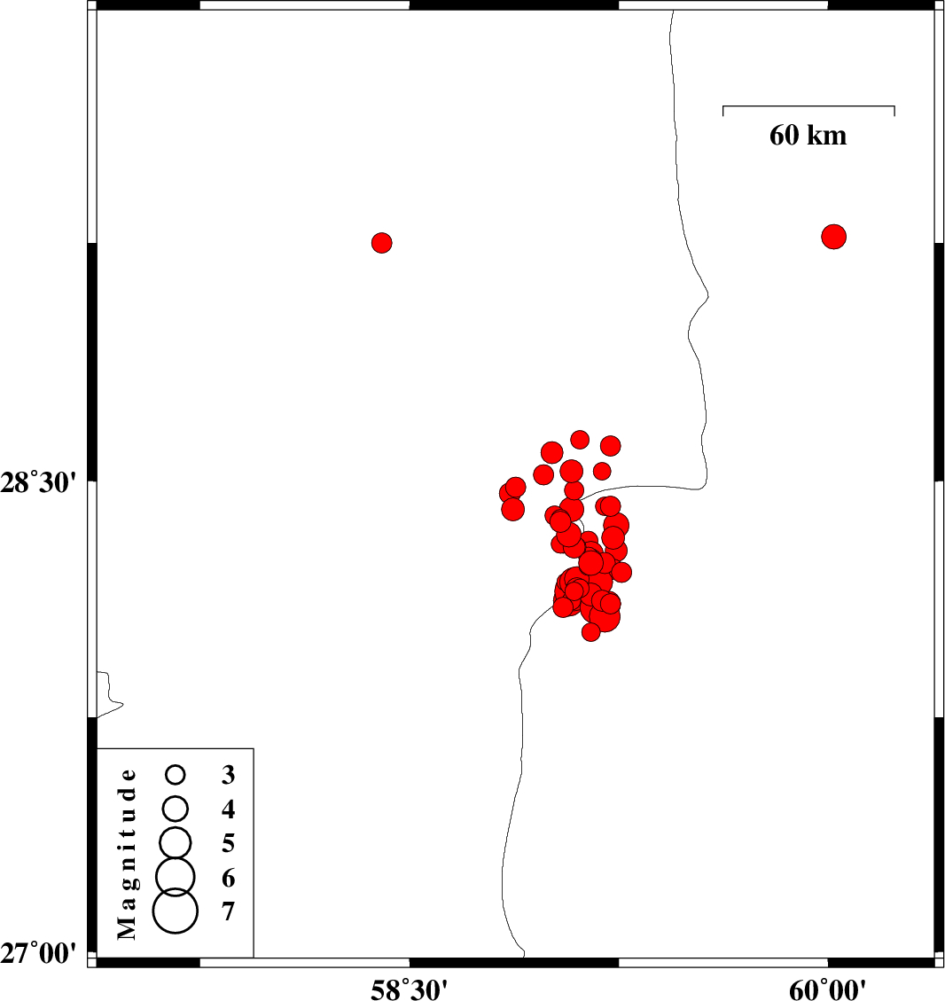 2011/01/27 08:38:28.5 12:08:28.5 28.1559.0915 Mb:6.2 Kerman Province, 139 km North-East of Kahnuj