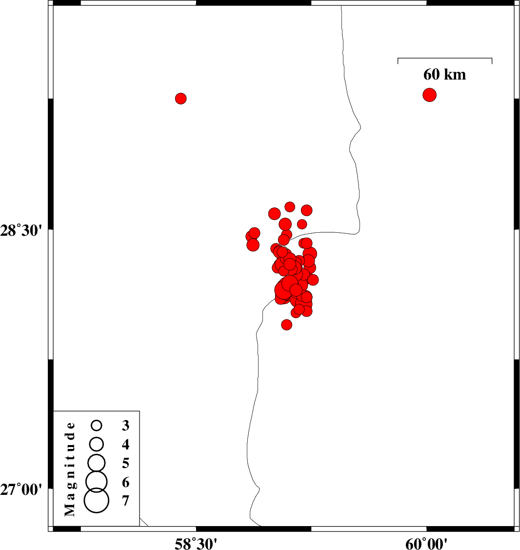 2011/01/27 08:38:28.5 12:08:28.5 28.1559.0915 Mb:6.2 Kerman Province, 139 km North-East of Kahnuj