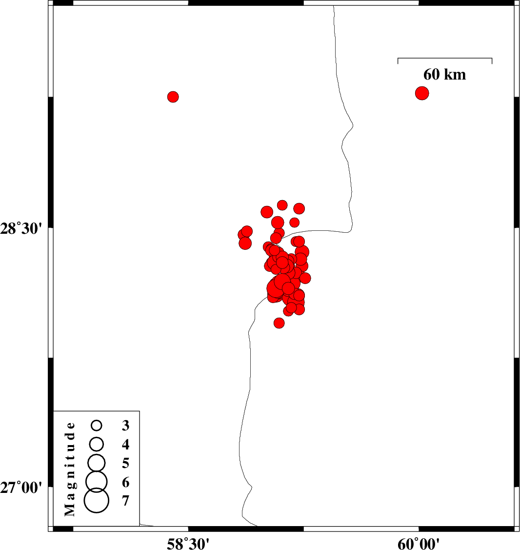 2011/01/27 08:38:28.5 12:08:28.5 28.1559.0915 Mb:6.2 Kerman Province, 139 km North-East of Kahnuj