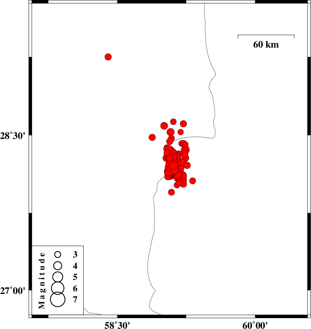 2011/01/27 08:38:28.5 12:08:28.5 28.1559.0915 Mb:6.2 Kerman Province, 139 km North-East of Kahnuj