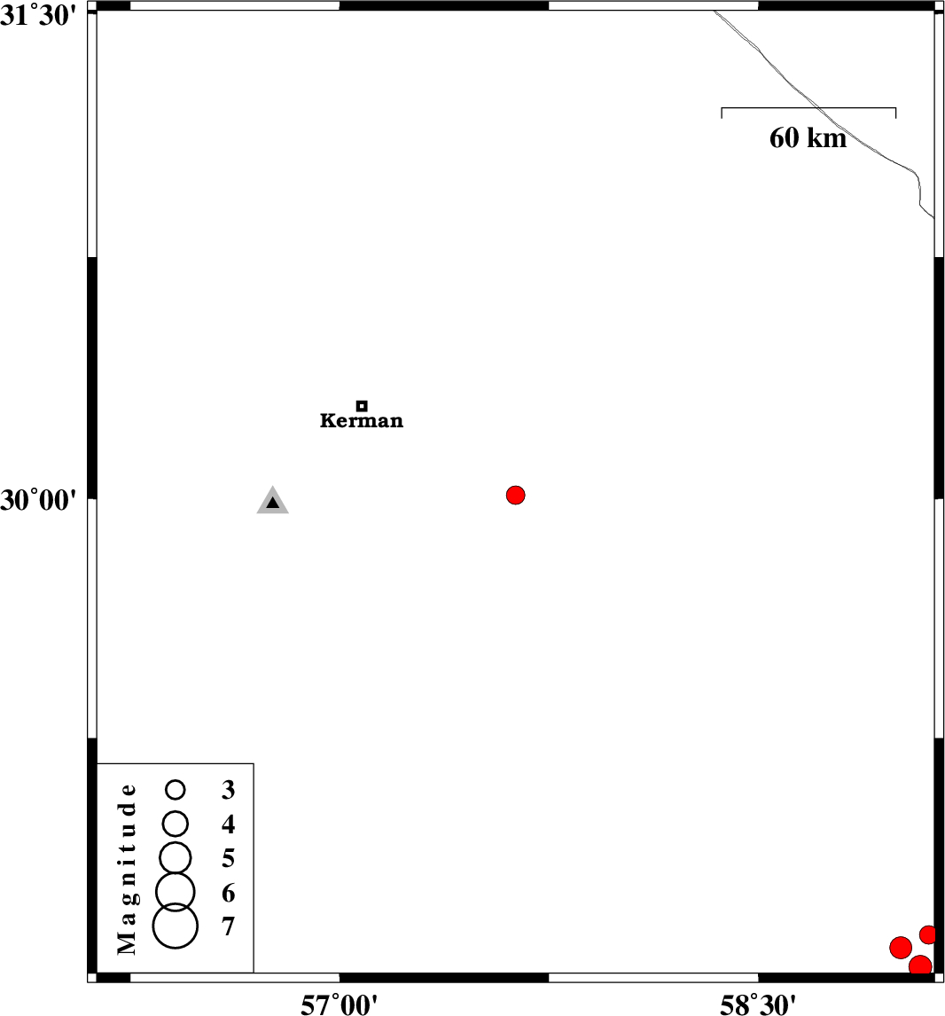 | 2011/01/27 | 09:15:29.9 | 12:45:29.9 | 28.59 | 59.01 | 15 | ML:3.5 | Kerman Province, 86 km South-East of Bam |
