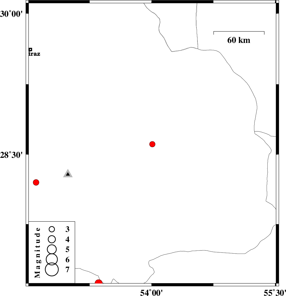 | 2011/02/04 | 20:01:31.9 | 23:31:31.9 | 28.2 | 52.6 | 27 | ML:3.2 | Fars Province, 70 km South of Firuz Abad | ||
