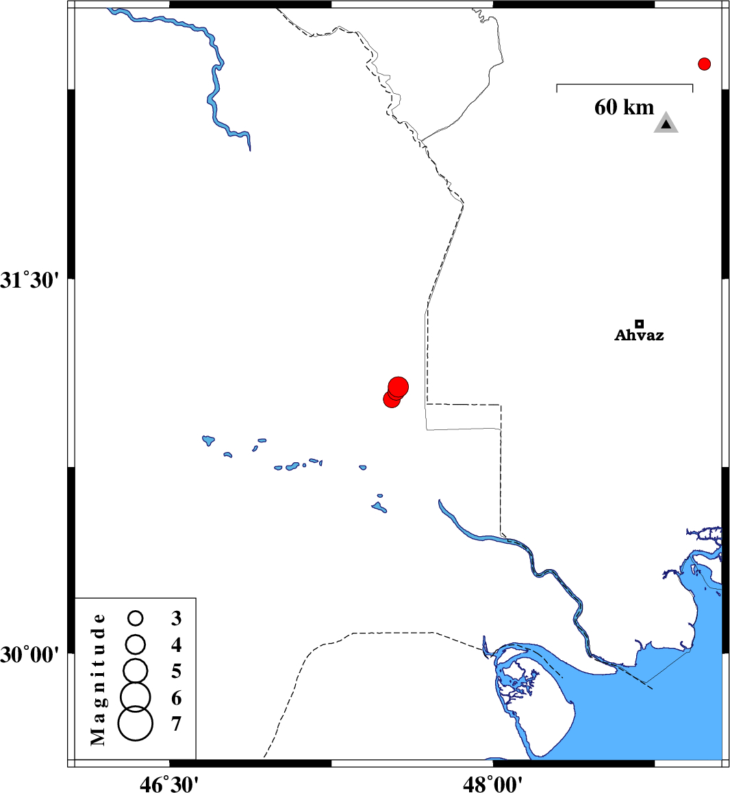 2011/01/19 | 03:20:50.7 | 06:50:50.7 | 32.35 | 48.98 | 27 | ML:2.6 | Khoozestan Province, 13 km West of Lali | ||