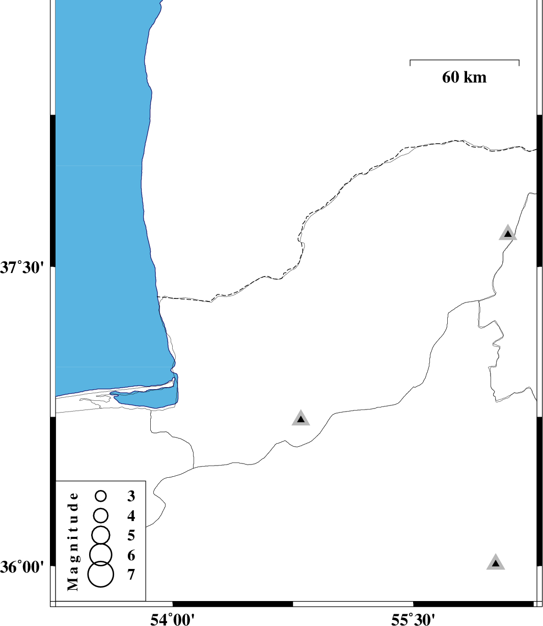 | 2011/02/07 | 21:35:39.3 | 01:05:39.3 | 37.32 | 54.77 | 41 | ML:3.6 | Golestan Province, 34 km West of Gonbad-e kavus |
