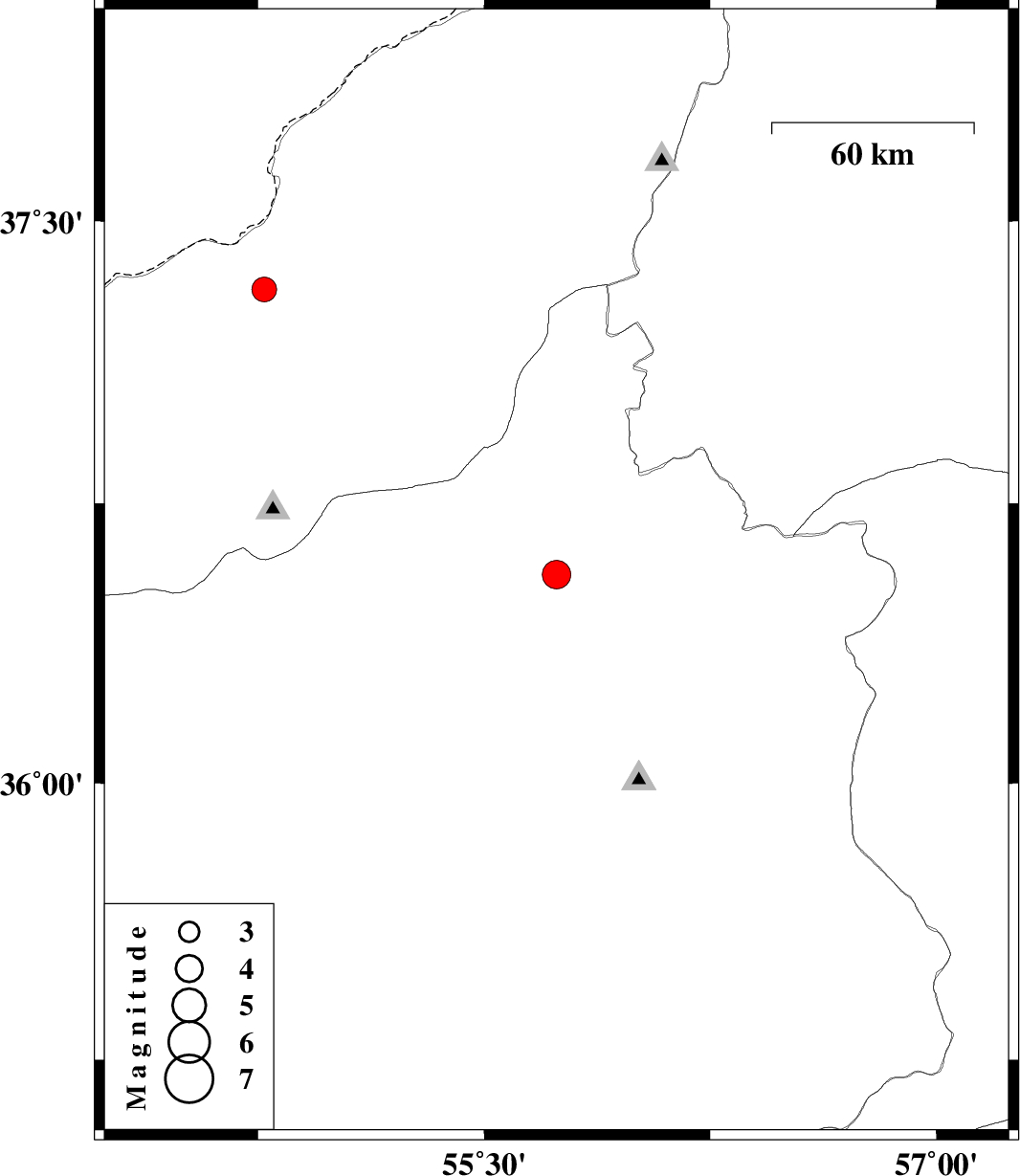 | 2011/02/07 | 21:35:39.3 | 01:05:39.3 | 37.32 | 54.77 | 41 | ML:3.6 | Golestan Province, 34 km West of Gonbad-e kavus |