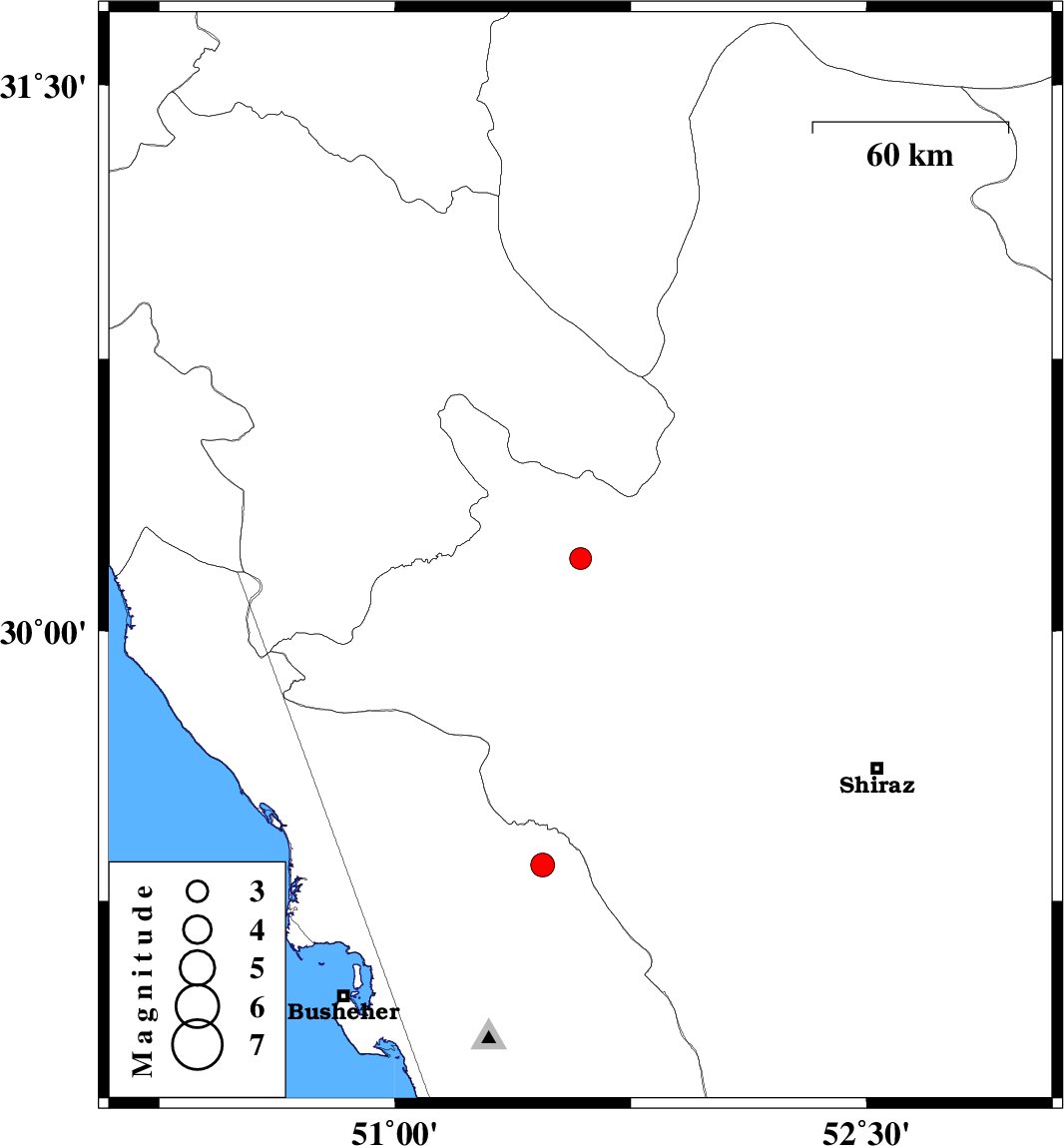 | 2011/02/09 | 18:11:06.7 | 21:41:06.7 | 29.35 | 51.47 | 15 | ML:3.4 | Bushehr Province, 27 km East of Borazjan |