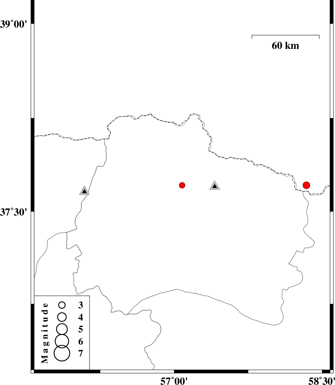 | 2011/01/15 | 14:24:07.8 | 17:54:07.8 | 37.71 | 58.34 | 14 | ML:3.3 | 26 km South of Ashgabat |