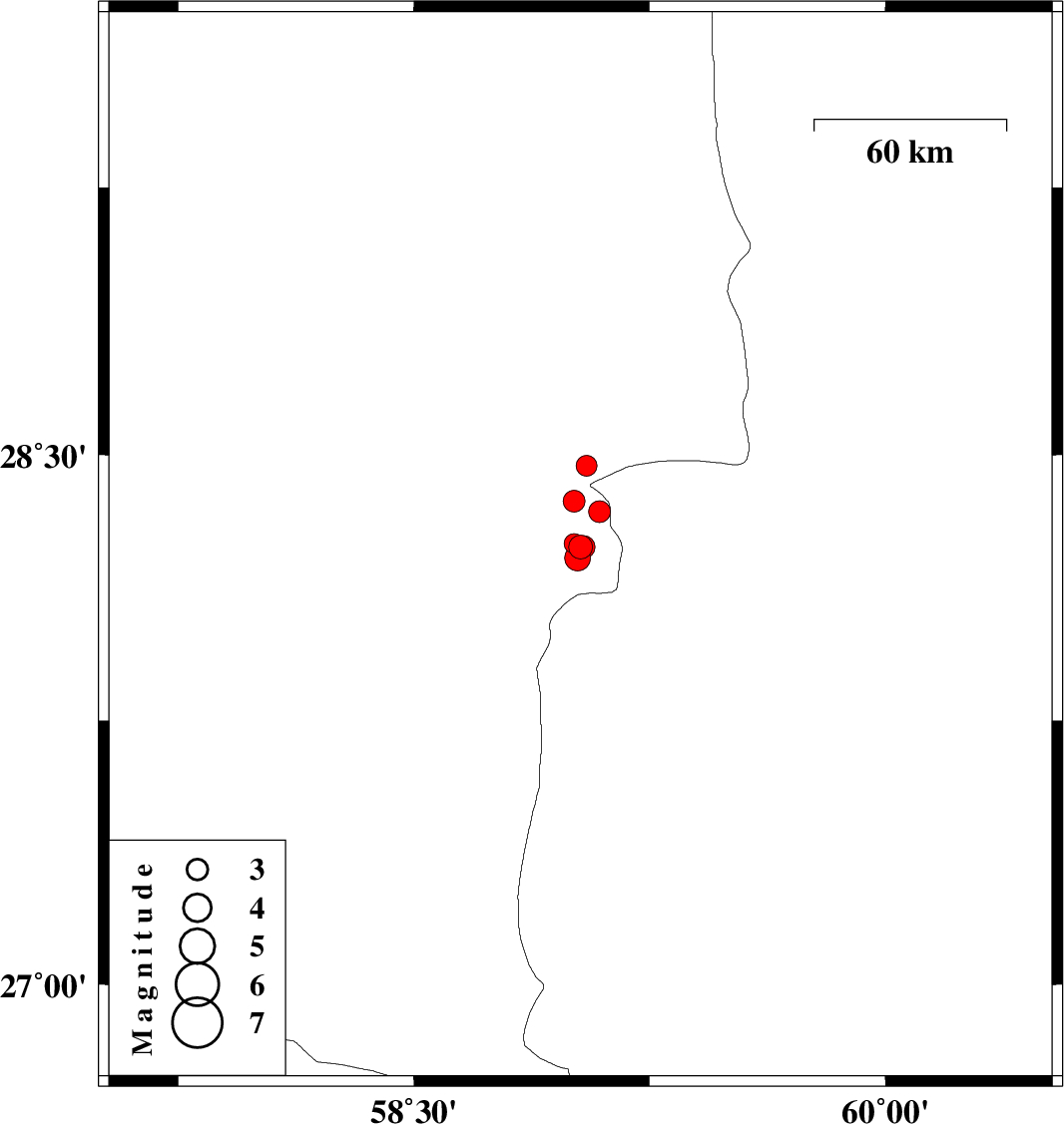 | 2011/02/06 | 06:01:07.6 | 09:31:07.6 | 28.47 | 59.05 | 15 | ML:3 | Kerman Province, 98 km South-East of Bam | ||