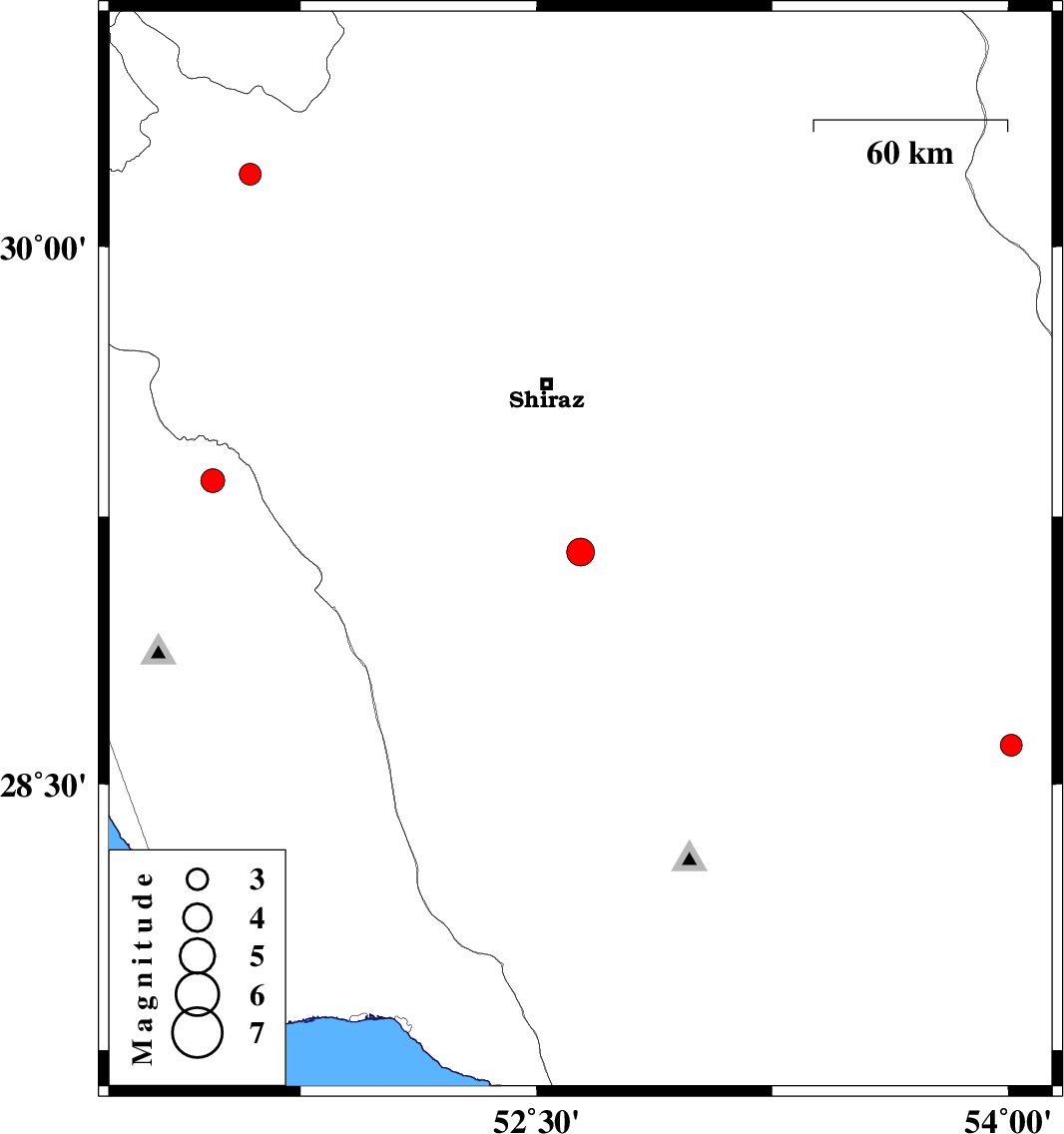 | 2011/02/13 | 11:56:13.8 | 15:26:13.8 | 29.15 | 52.64 | 10 | ML:4 | Fars Province, 36 km North of Firuz Abad | ||