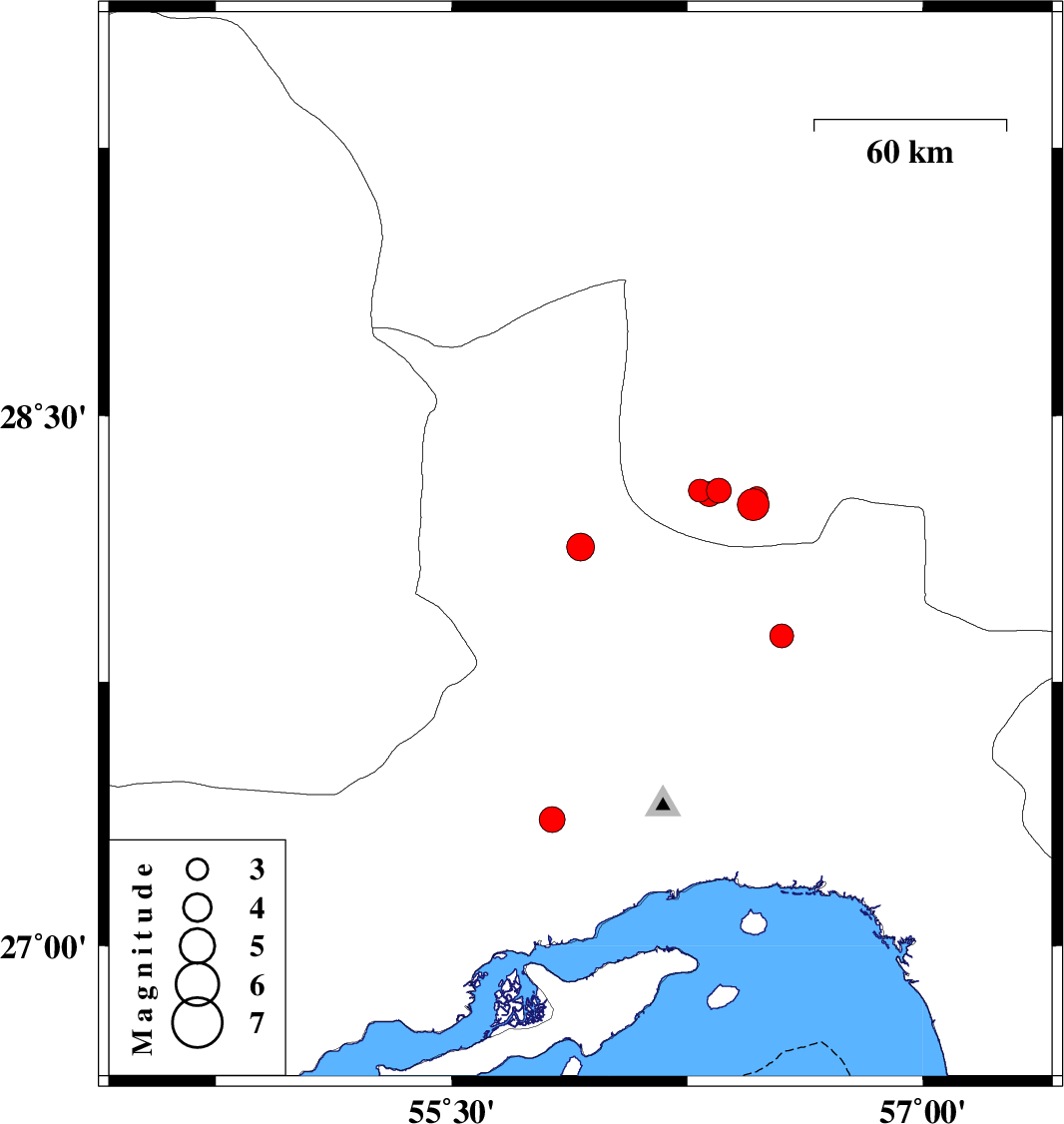 | 2011/02/18 | 17:13:26.5 | 20:43:26.5 | 26.71 | 54.46 | 14 | ML:3.6 | Hormozgan Province, 44 km North-West of Bandar-e lengeh | ||