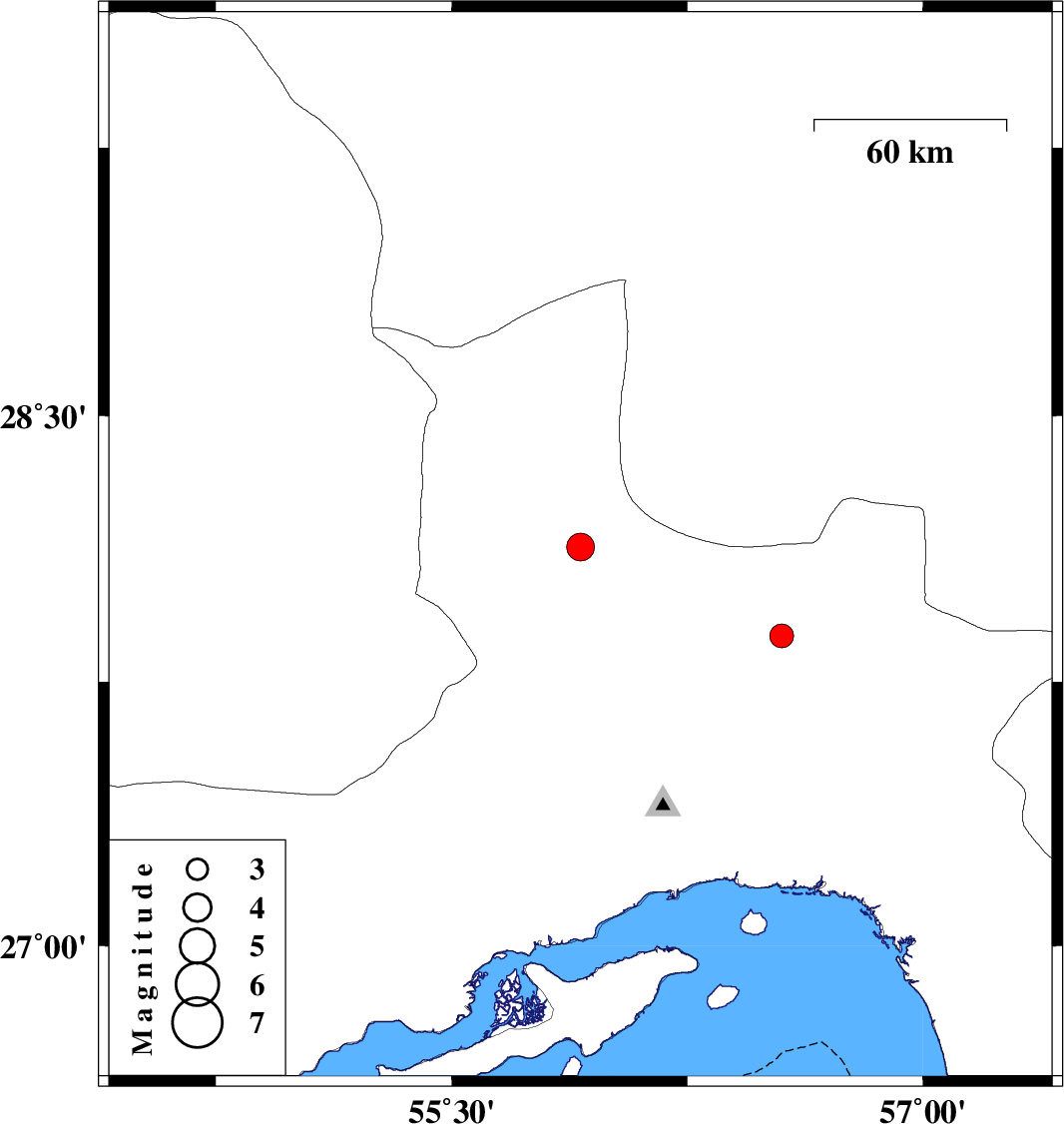 | 2011/02/18 | 17:13:26.5 | 20:43:26.5 | 26.71 | 54.46 | 14 | ML:3.6 | Hormozgan Province, 44 km North-West of Bandar-e lengeh | ||