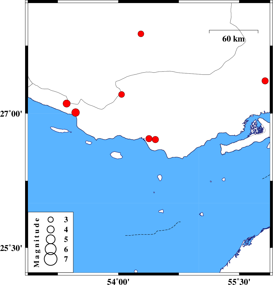 | 2011/02/18 | 17:13:26.5 | 20:43:26.5 | 26.71 | 54.46 | 14 | ML:3.6 | Hormozgan Province, 44 km North-West of Bandar-e lengeh | ||